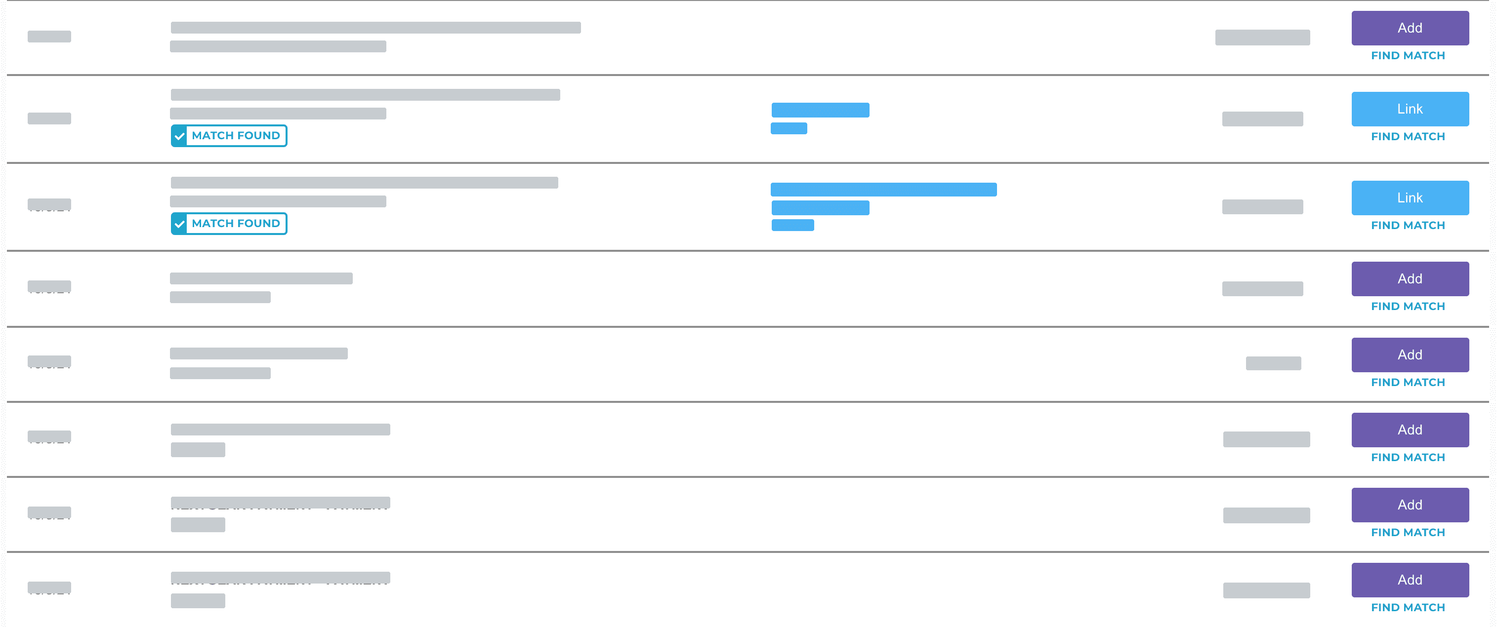 The Add functionality is used when an option for Linking, Paying, Receiving, or Depositing is unavailable. You can also override the suggested choice to Link, Pay, Receive, or Deposit if the suggested match is incorrect.