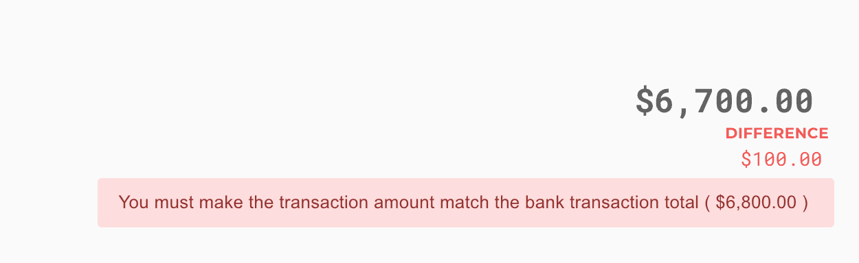 If your added lines don't equal the exact amount from the bank feed, a warning will be shown, and you'll need to make the amounts match before being allowed to Add the transaction.