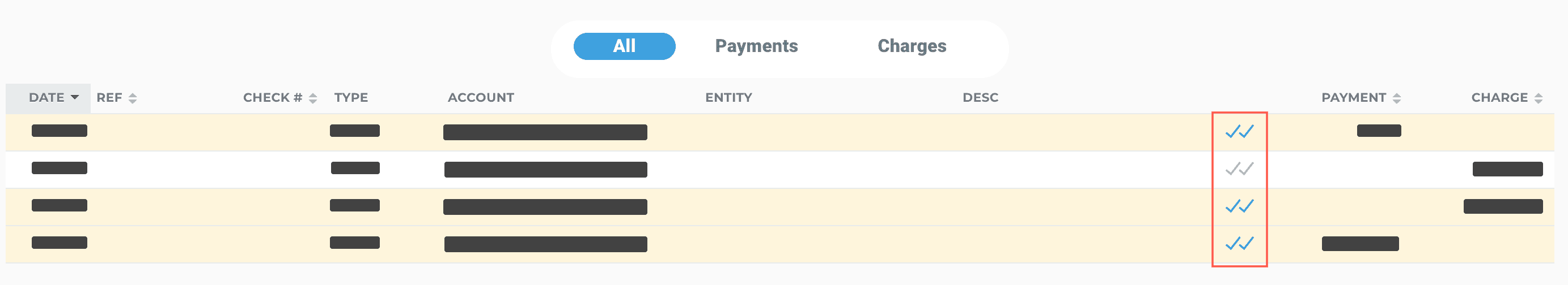 On your bank statement, go through each transaction one-by-one and find the transaction in the reconciliation list. Once you've found it, click the checkboxes to reconcile it.