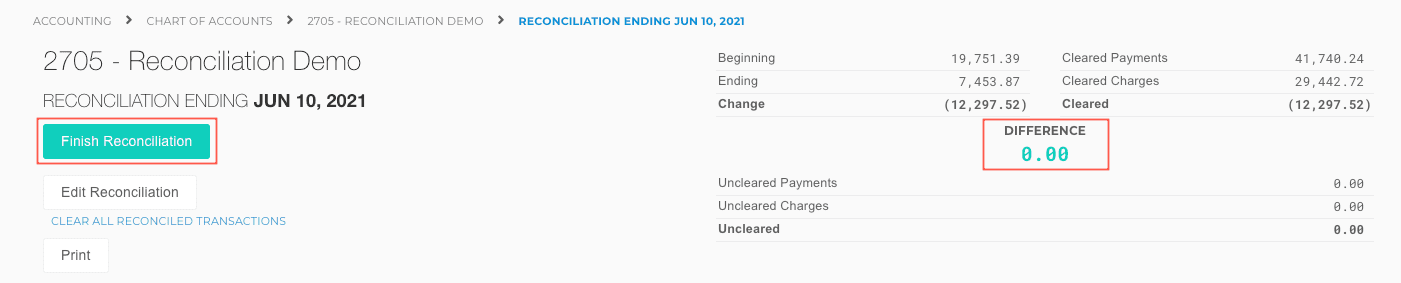 Once you're done reconciling and your Difference is $0.00, you can finish the reconciliation and lock it.