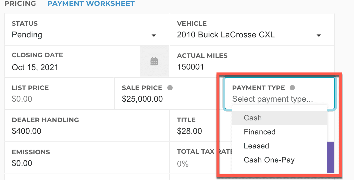 Cash deals are easy to structure, and have no payment terms. The customer is expected to pay the full balance in cash or using a trade-in.