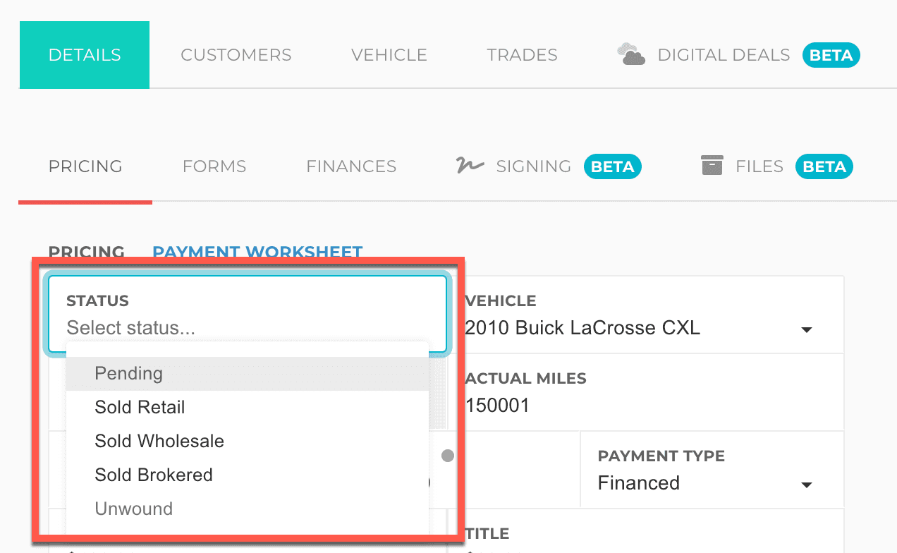 Deals in a "Pending" status haven't yet been closed or sold. Generally, these deals are waiting on something, like customer or lender approval. Oftentimes it's better to keep these types of deals as a Lead Worksheet.