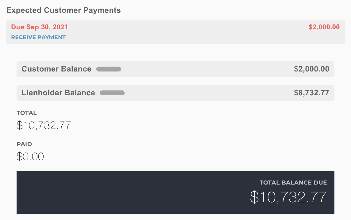 Balances are shown for the deal for the customer, lienholder, and lessor based on the deal structure.