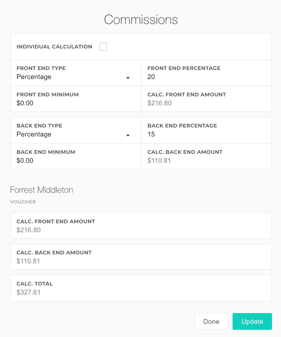 If you want to override calculations for each salesperson, you can check the Individual Calculation checkbox near the top of the dialog and calculate percentage-based or fixed commissions for each salesperson. This can be useful if you have a finance manager and salesperson involved in a deal.