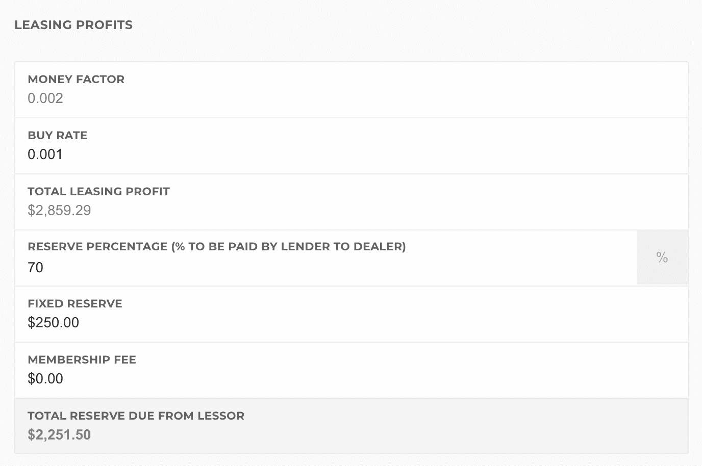 In the Deals system, you'll enter your sell rate as the money factor the customer is going to be contracted for. Then, enter your Buy Rate in the lease profits section. You'll see a Total Leasing Profit number show. This number is calculated by the following method: