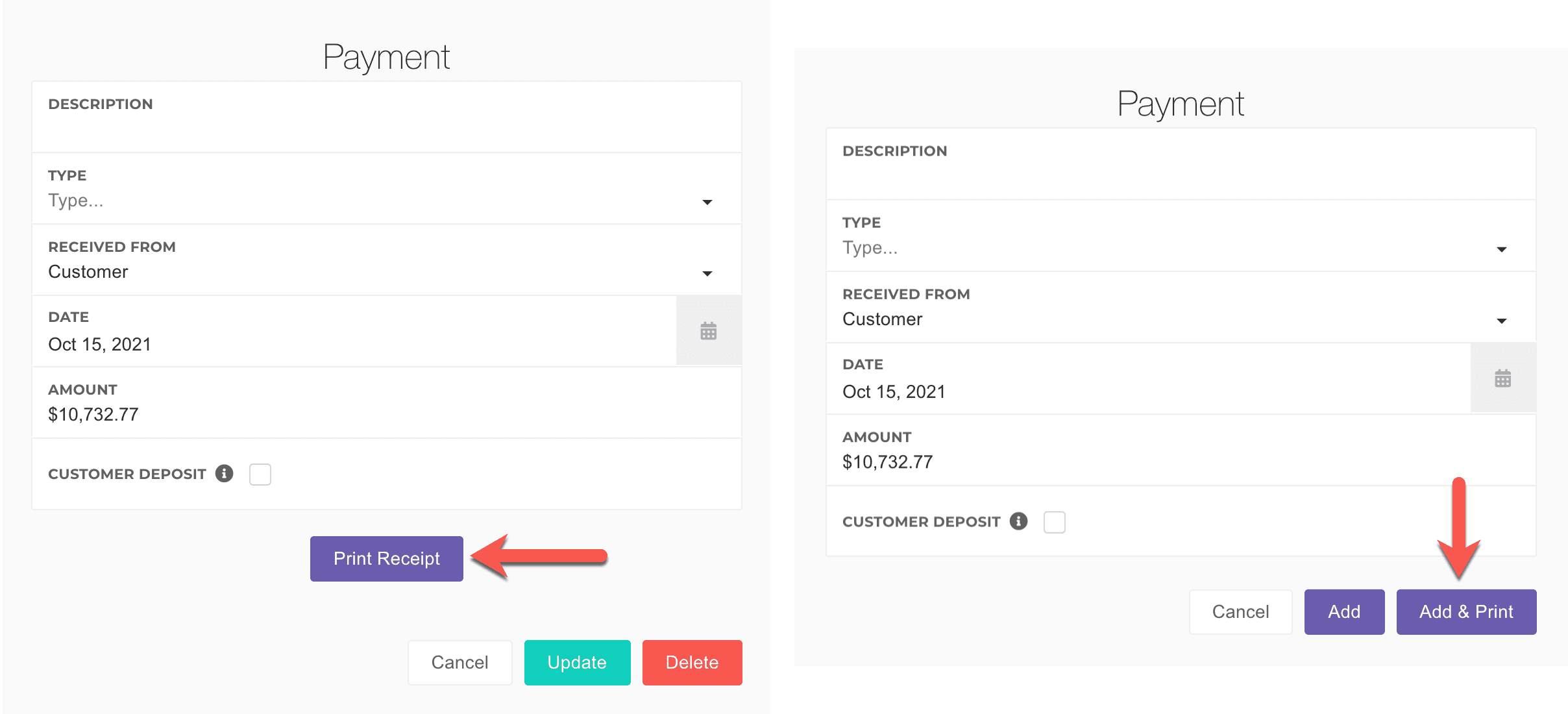 You can print a receipt for a payment by opening the payment and clicking the Print Receipt button, or by clicking the Add & Print button when adding a payment.