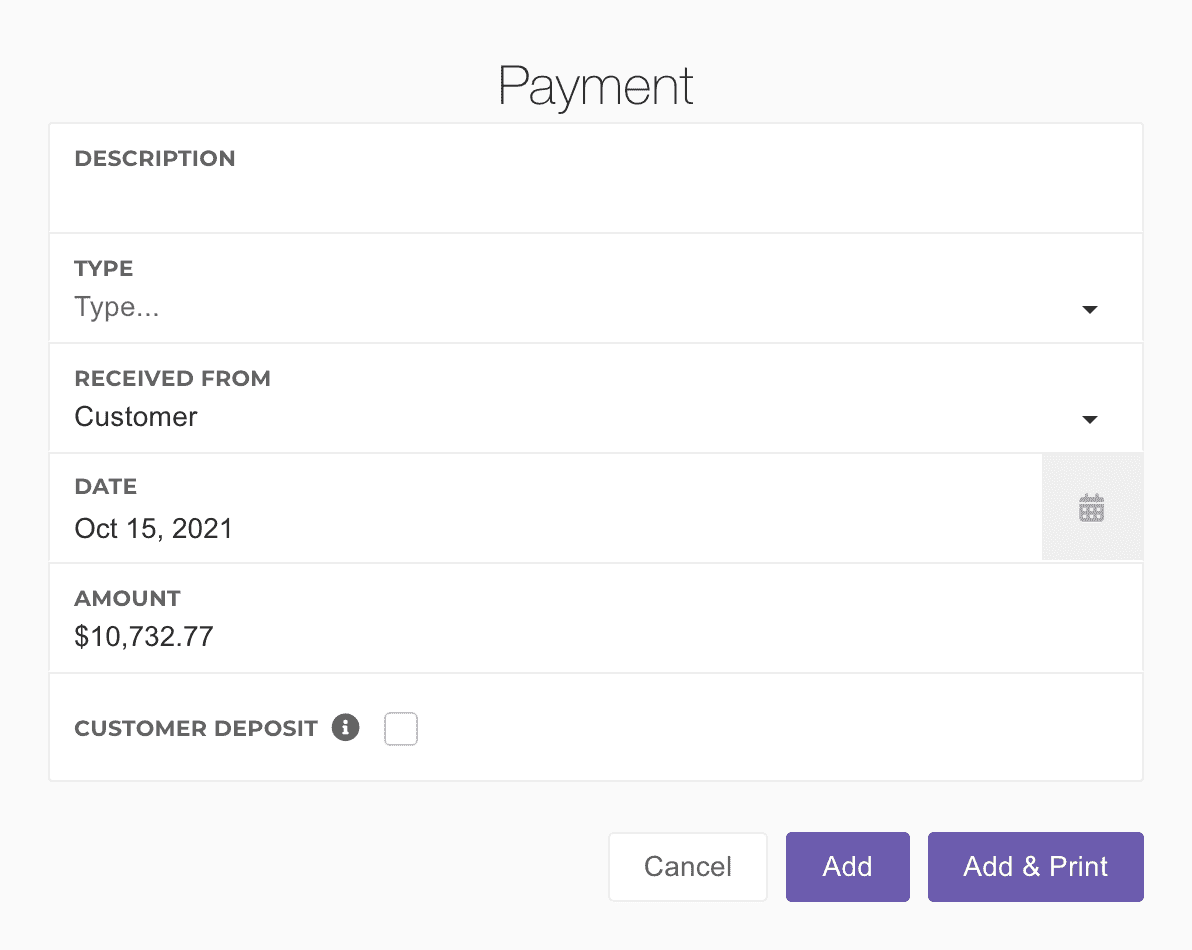 Adding payments is easily done in the Payments section.