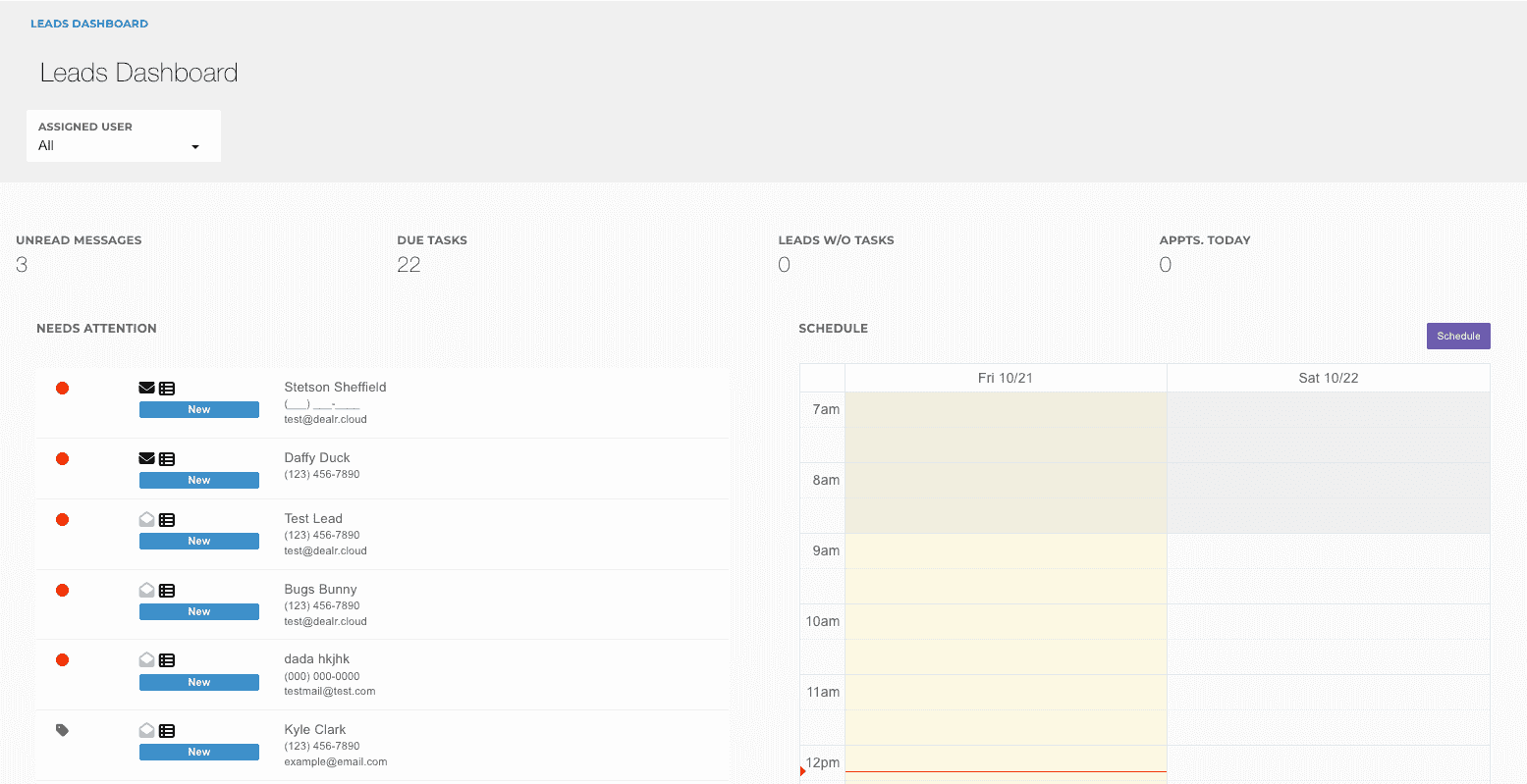 The Leads Dashboard offers your sales staff a quick and easy way to see all outstanding items on their existing leads while also surfacing any new leads that might have arrived overnight.