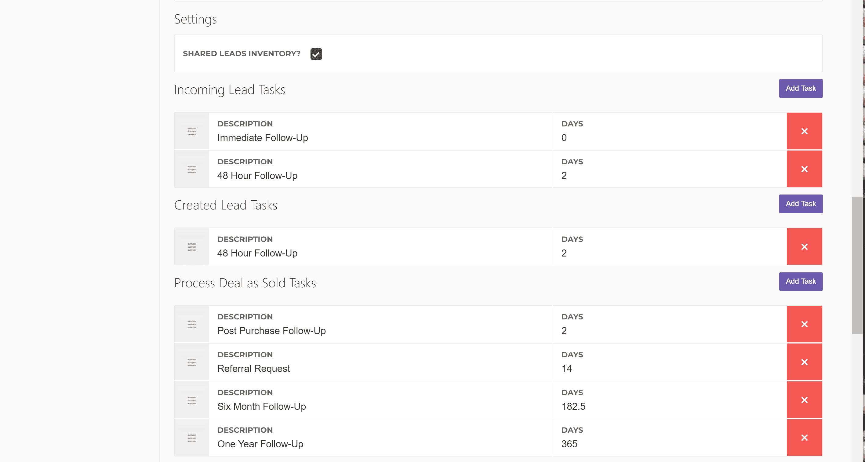 These default tasks will populate once a lead is attached to a process-as-sold deal or the lead status is changed to Sold. These tasks are aimed for any post-sale follow-up tasks for the lead in question.