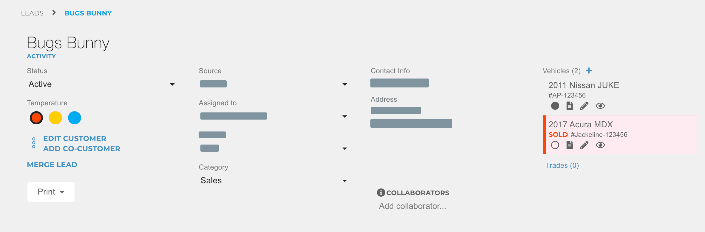 Vehicles can be added to leads to track customer interest. Multiple vehicles can be on each lead.