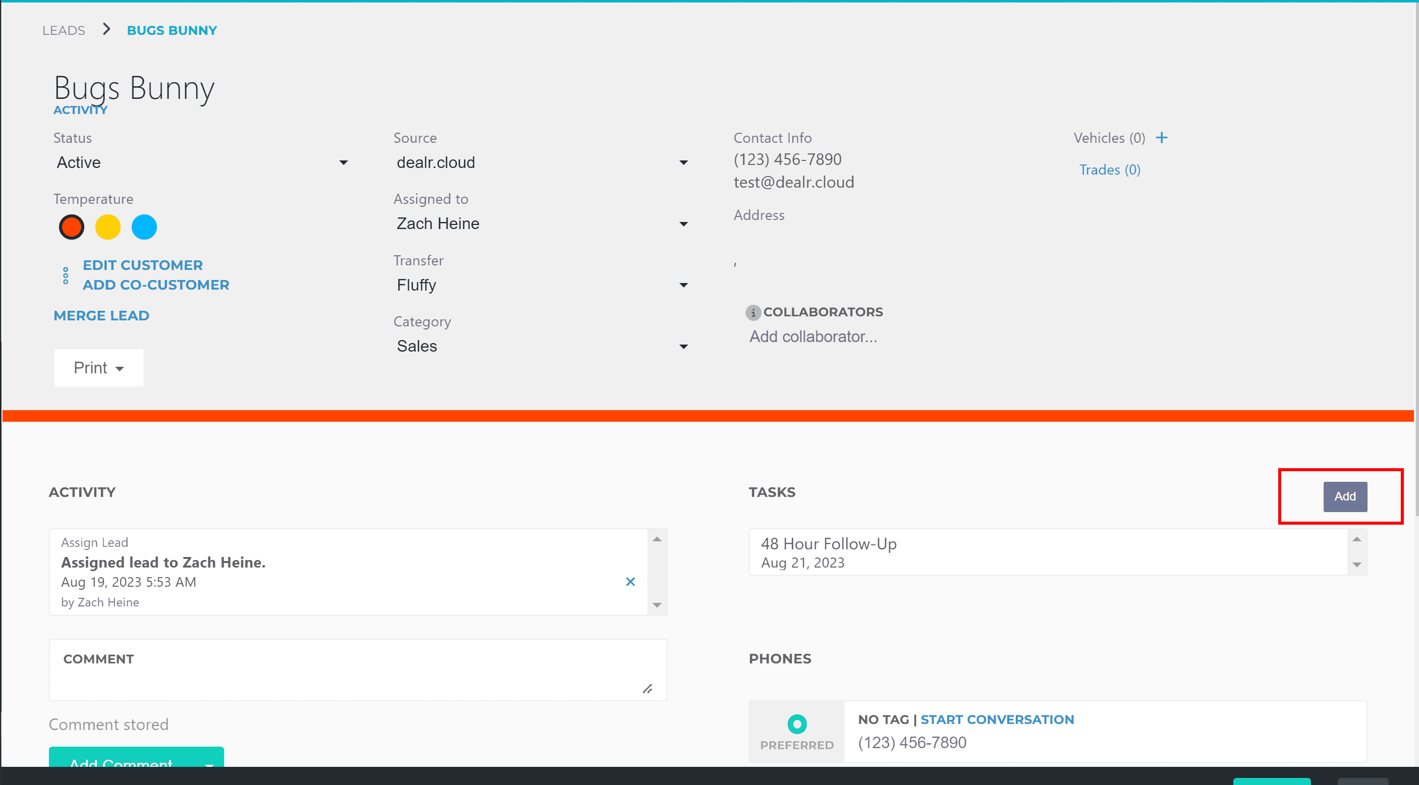Collaborators can be added to a lead so that multiple salespeople can get notified and work the same lead. This can be useful if one salesperson is out for part of the week, but the customer still needs to be communicated with.