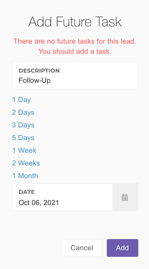 You'll also be asked to create the next follow-up task for your lead. This helps make sure your lead never falls off your radar.