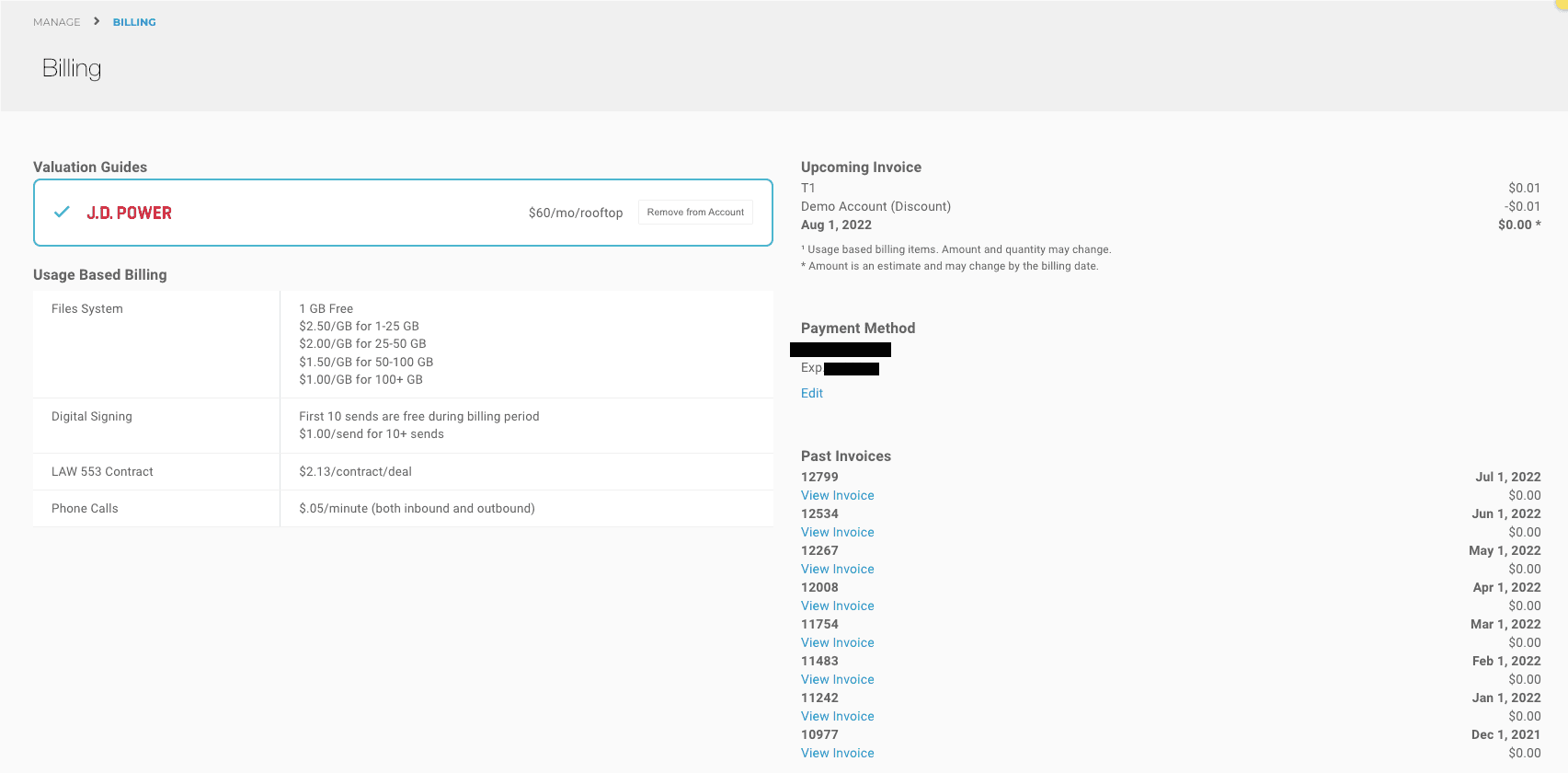 Billing allows you to track, manage, and update your all of your billing information for your account. Here's what your billing should look like,