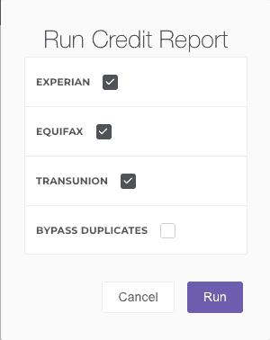 To pull a credit report for a customer, click on the Run Credit button. This will prompt you to select where the credit report is taken from: