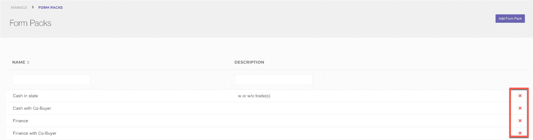 Navigate to Manage > Form Packs and then create a form pack by clicking the Add Form Pack button. Once your form pack is created, you can edit to copy an existing form pack, add forms, and more!