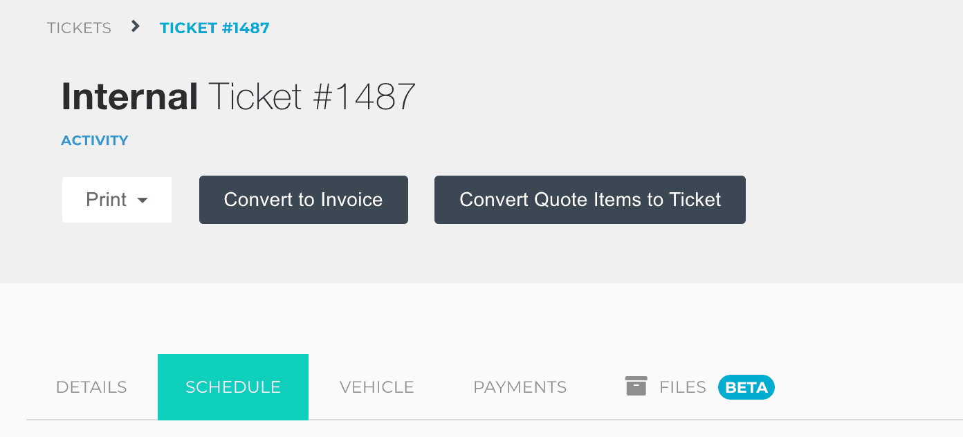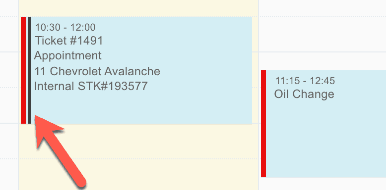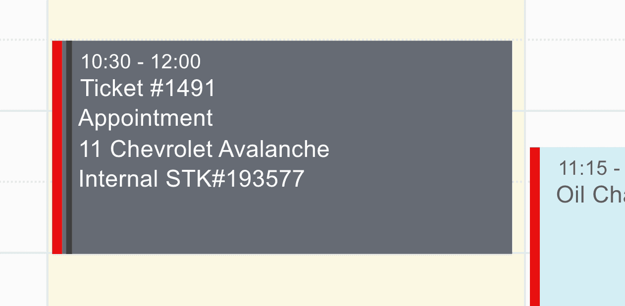 If the appointment was created from a ticket, the ticket #, vehicle, and customer will automatically show on the schedule. If a description was entered when creating the appointment, that will also show.