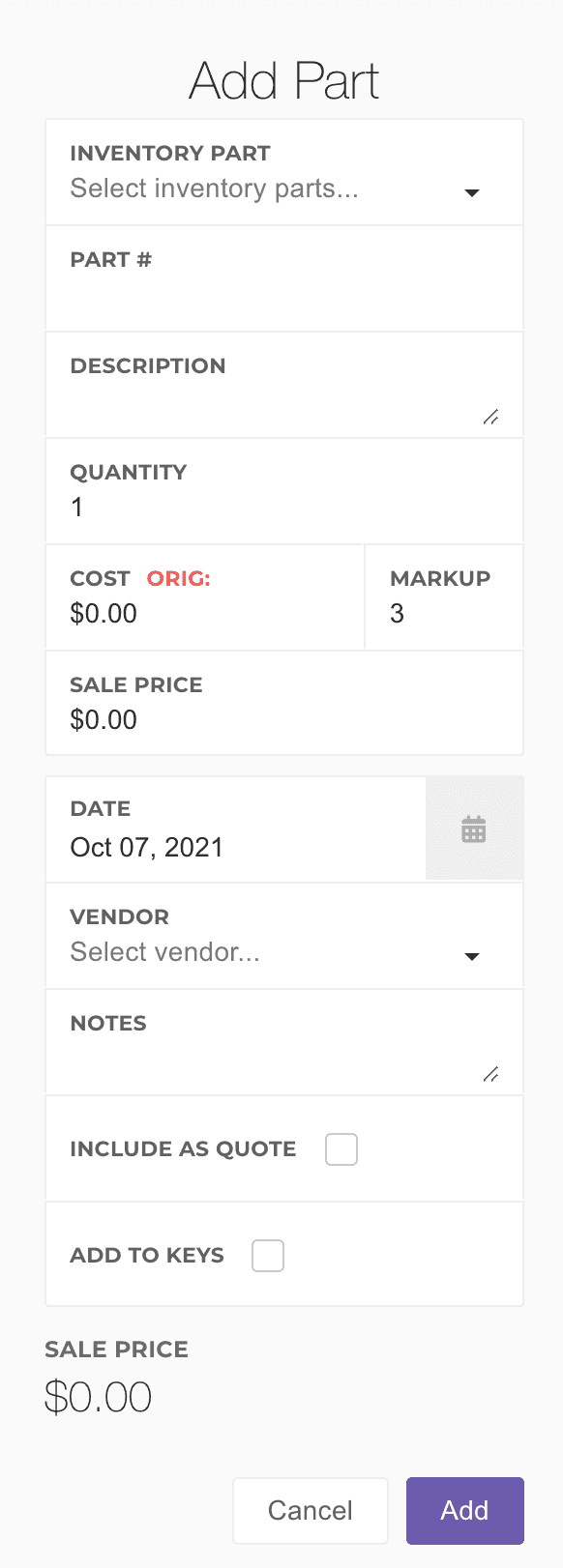 Sale Price: The sale price per unit of the part. Modifying this automatically adjusts the markup.