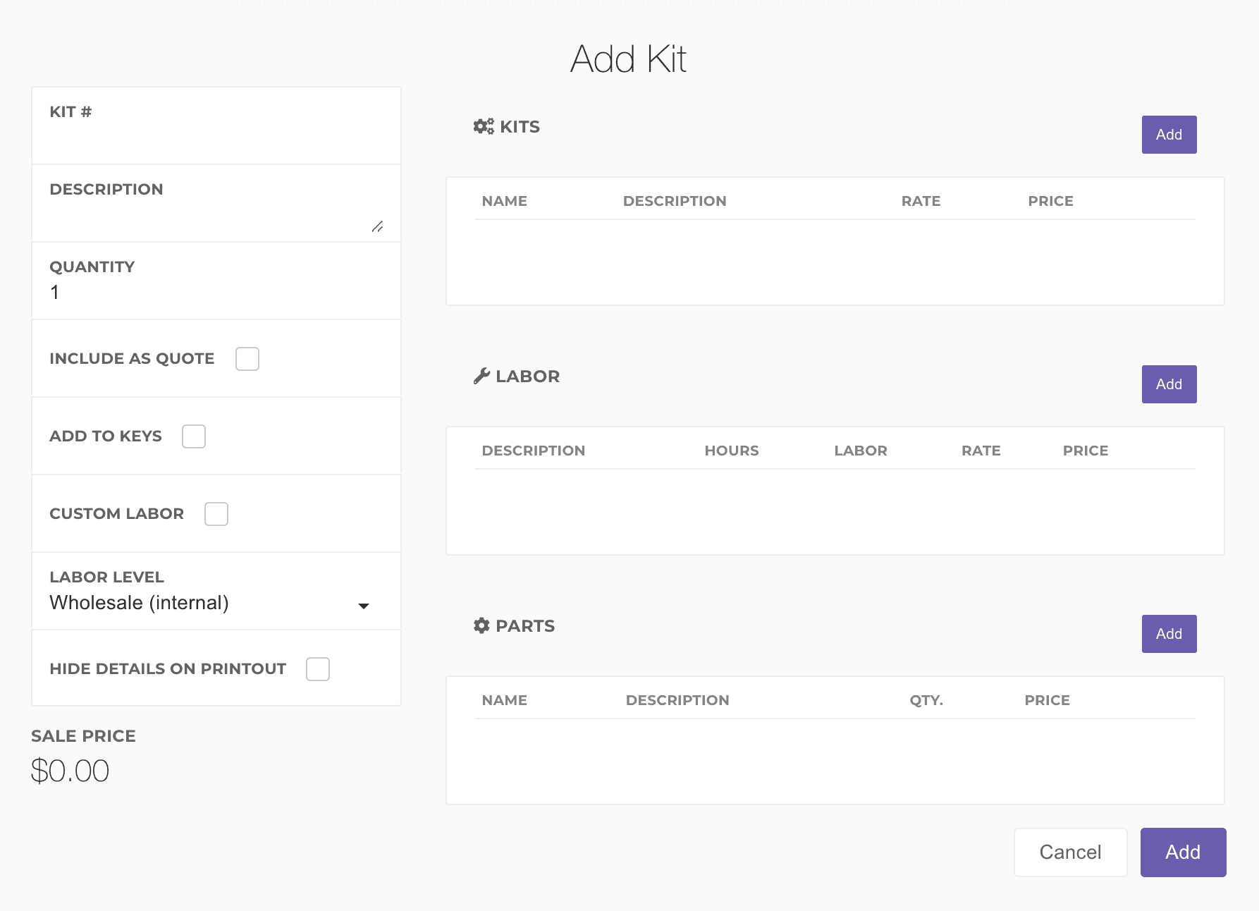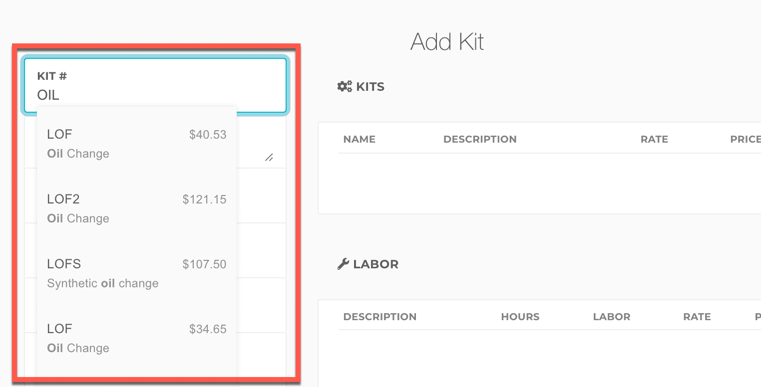 On the right side of the kit dialog, you can add labor, parts, and even other kits into the kit. For example, an engine replacement kit (unique to the ticket) could contain an oil change Key Kit.