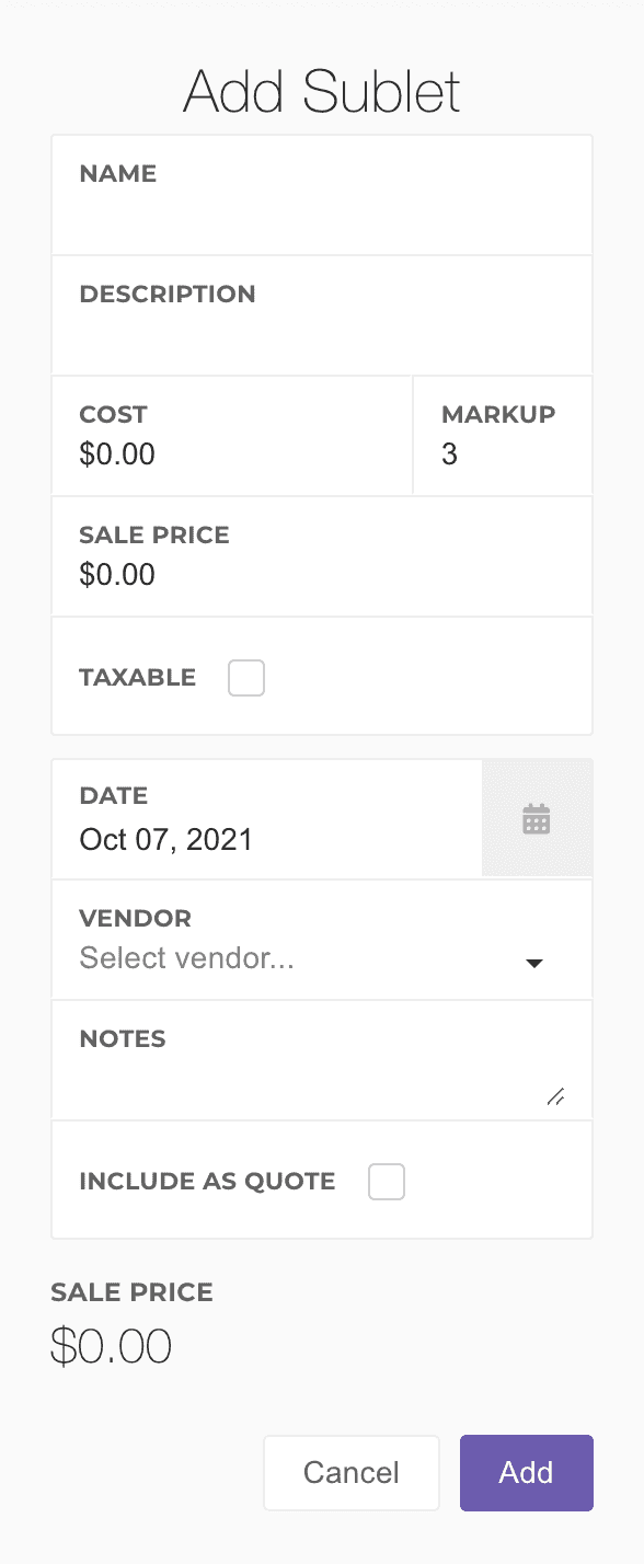Cost: The cost of the sublet work. Changing this automatically adjusts the markup and sale price.