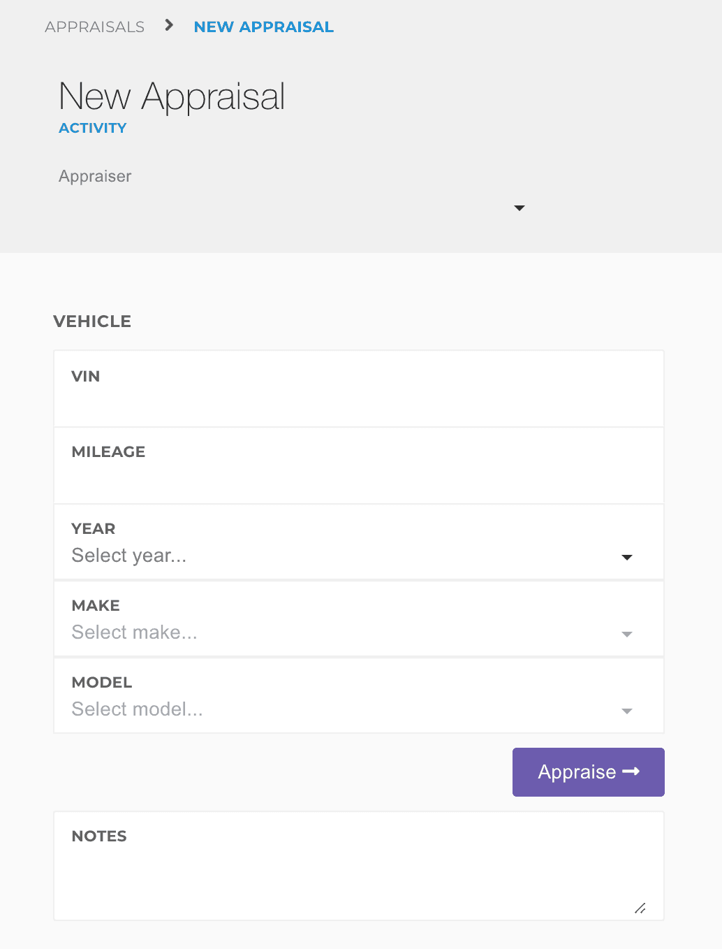 Enter in your VIN and the year, make, and model will decode, allowing you to appraise the vehicle on the right-hand side of the screen.
